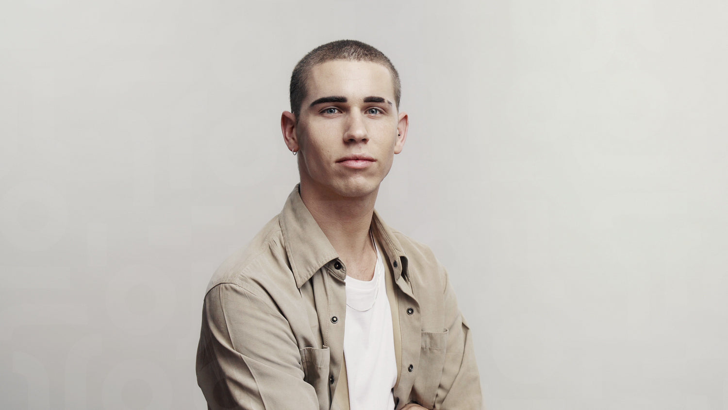 Happy young caucasian man looking at camera with his arms crossed. Stylish man standing on white background and smiling.