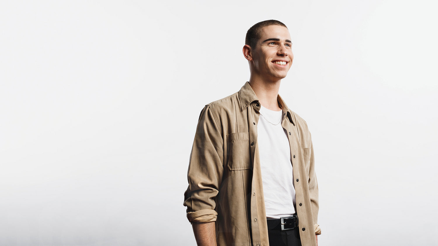 Portrait of smiling man isolated on white background. Young man wearing an unbuttoned shirt looking away.