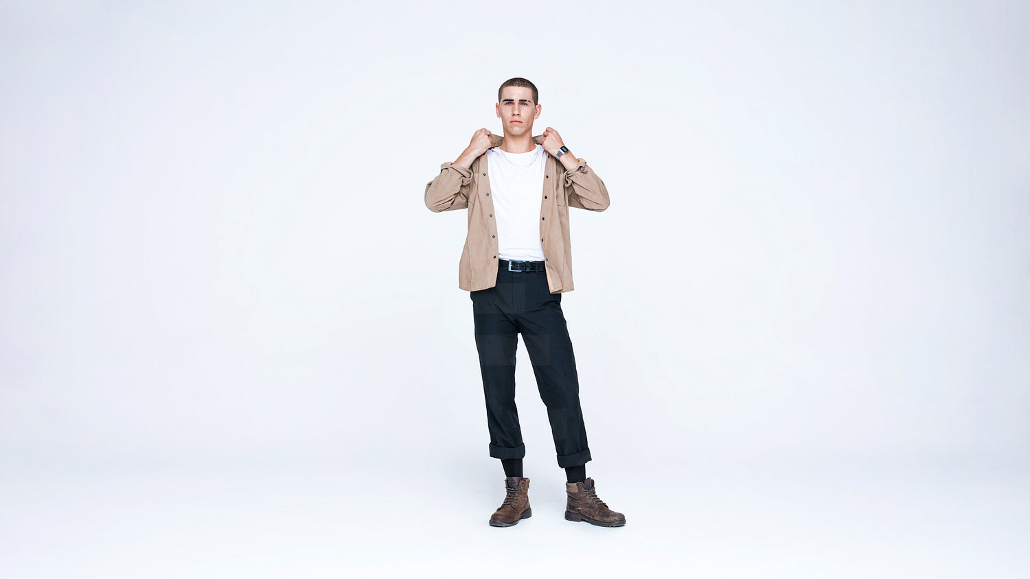 Young caucasian man looking at camera holding collar of his shirt. Casual man standing isolated on white background.