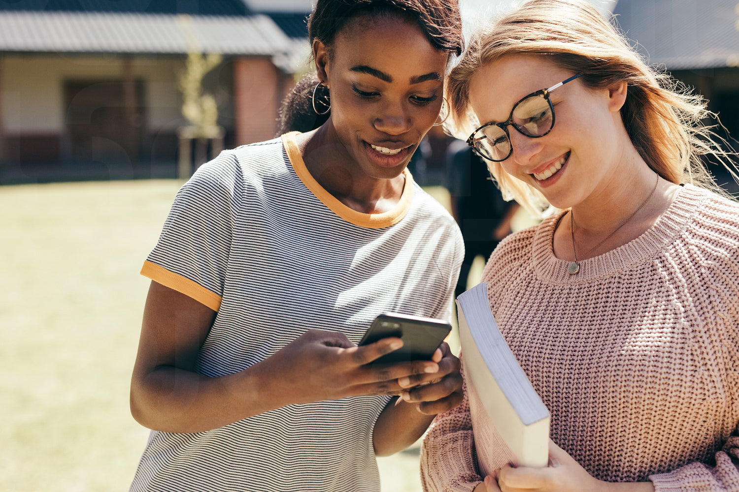 Two young women at college campus looking at mobile phone. High school girls walking in university campus with smart phone.