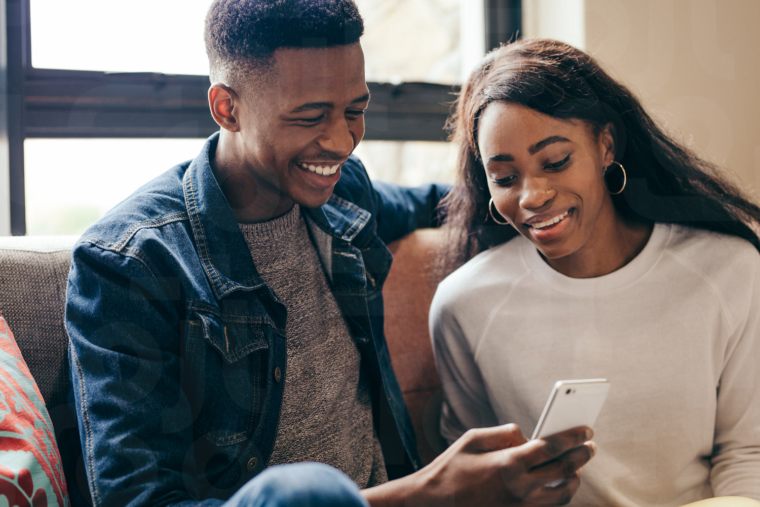 Students relaxing together in campus building. Young man and woman sitting at sofa looking at mobile phone.