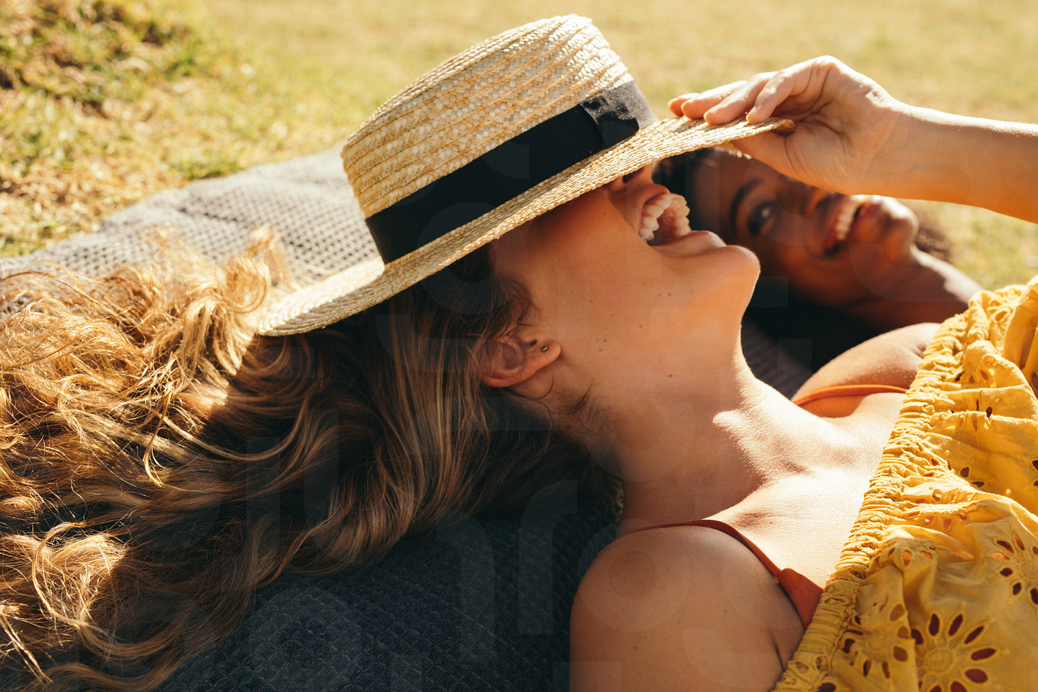 Close up of two women lying on ground in a park on a sunny day. Close up of a cheerful woman covering her face with a hat relaxing outdoors in a park with a friend.
