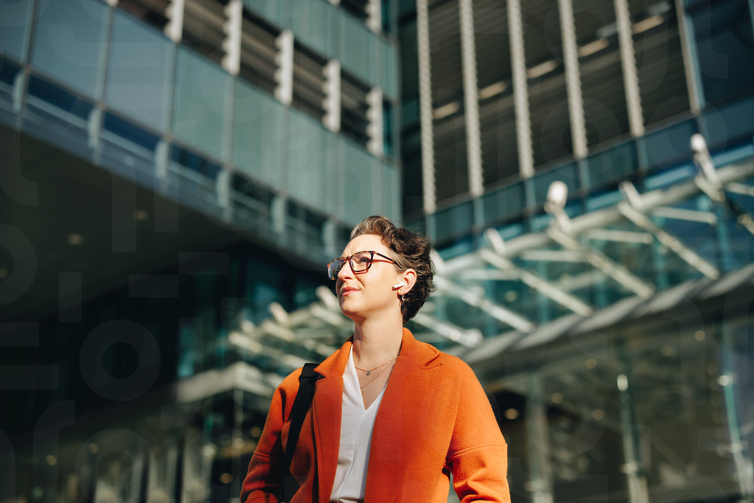 Low angle view of a mature businesswoman listening to music on earphones while commuting to work in the city. Thoughtful businesswoman walking to her office in the morning.