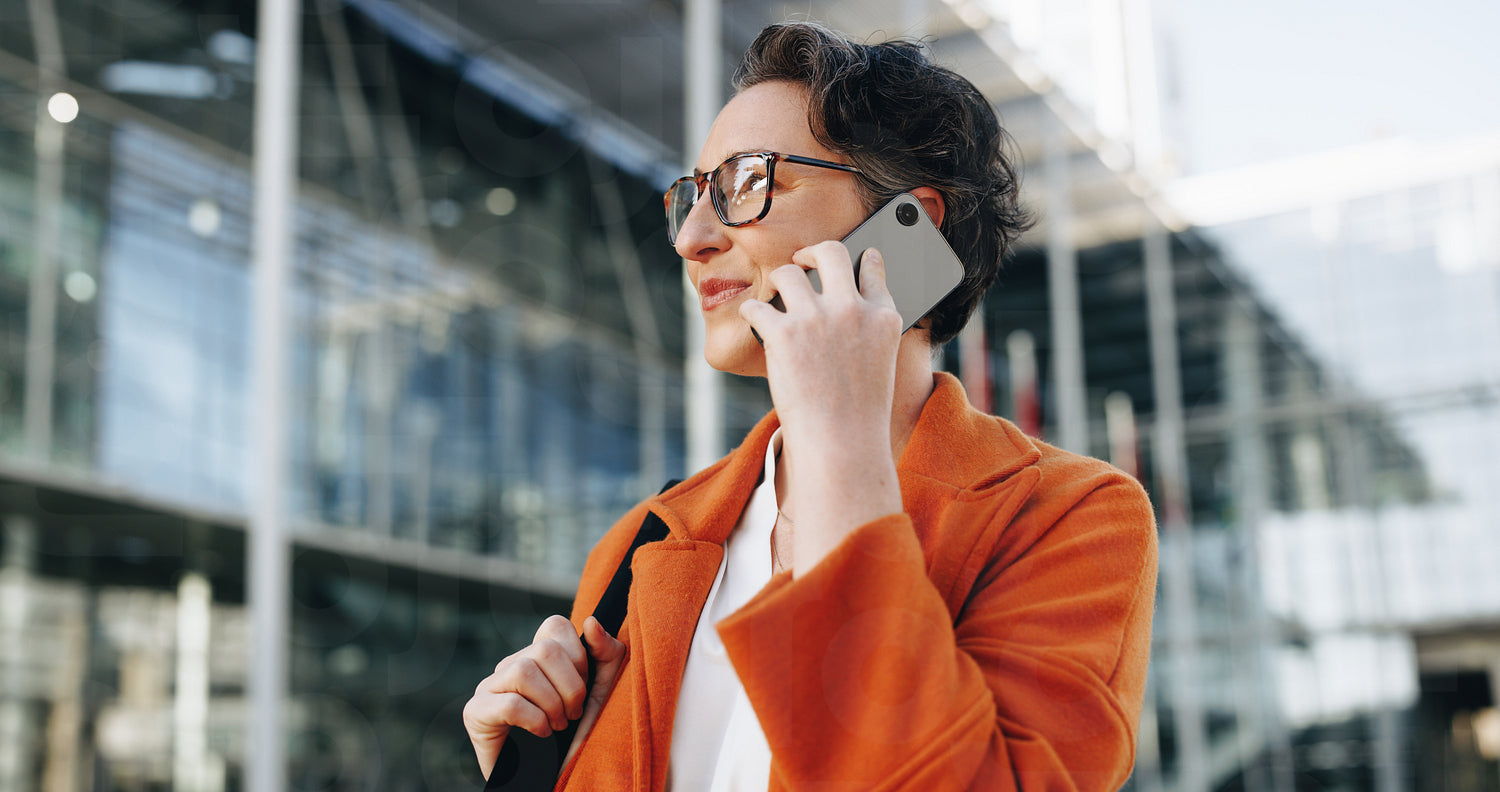 Mature businesswoman speaking on a phone call while commuting to work in the city. Business woman making plans for the day while walking to her office in the morning.