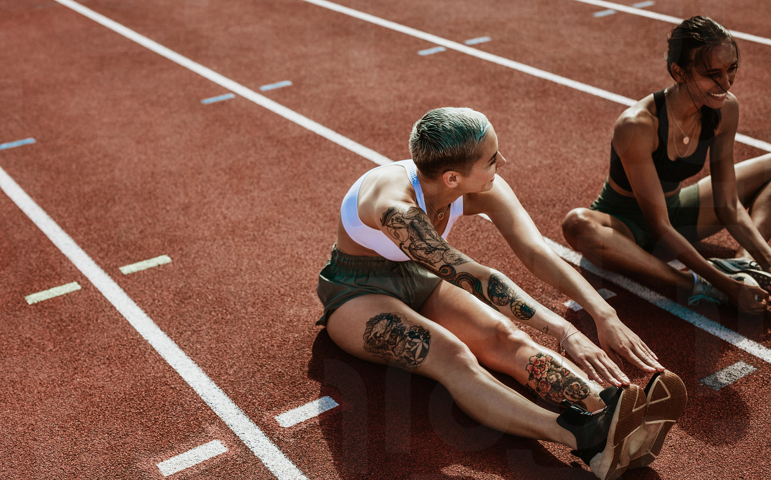 Two female athletes doing stretching exercises sitting on running track. Woman runners sitting on running track stretching legs.