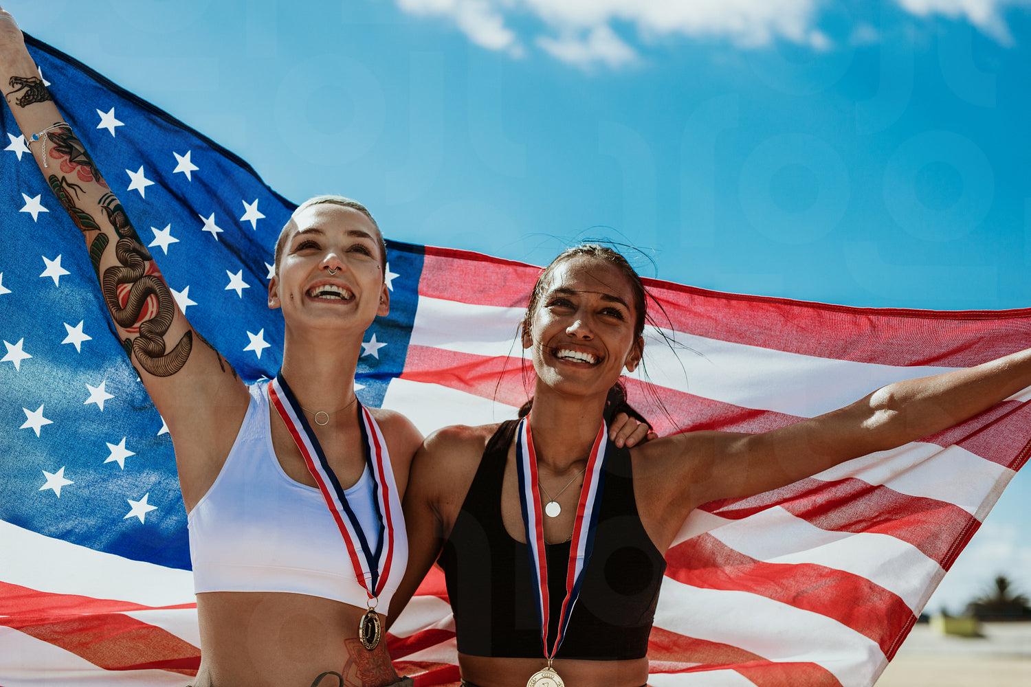 Two woman athletes holding up american flag outdoors. Female USA runners celebrating victory on running track in stadium.