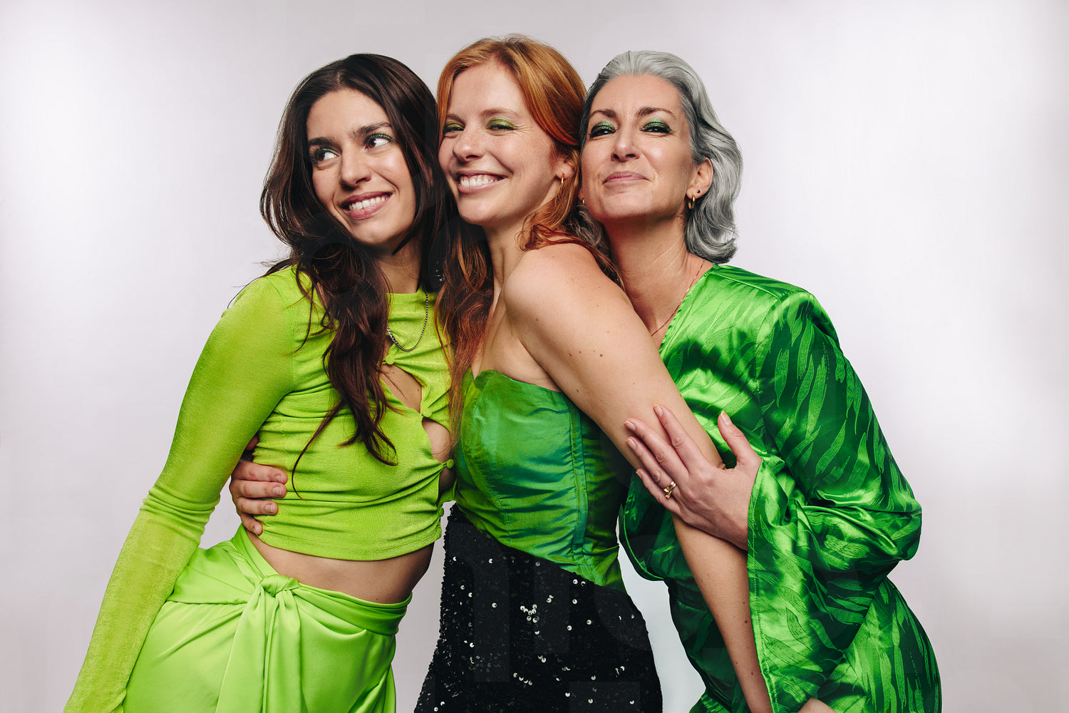 Three women pose closely in a studio portrait hugging and smiling with warm expressions conveying friendship, connection and joy across generations in fashionable outfits and confident body language.