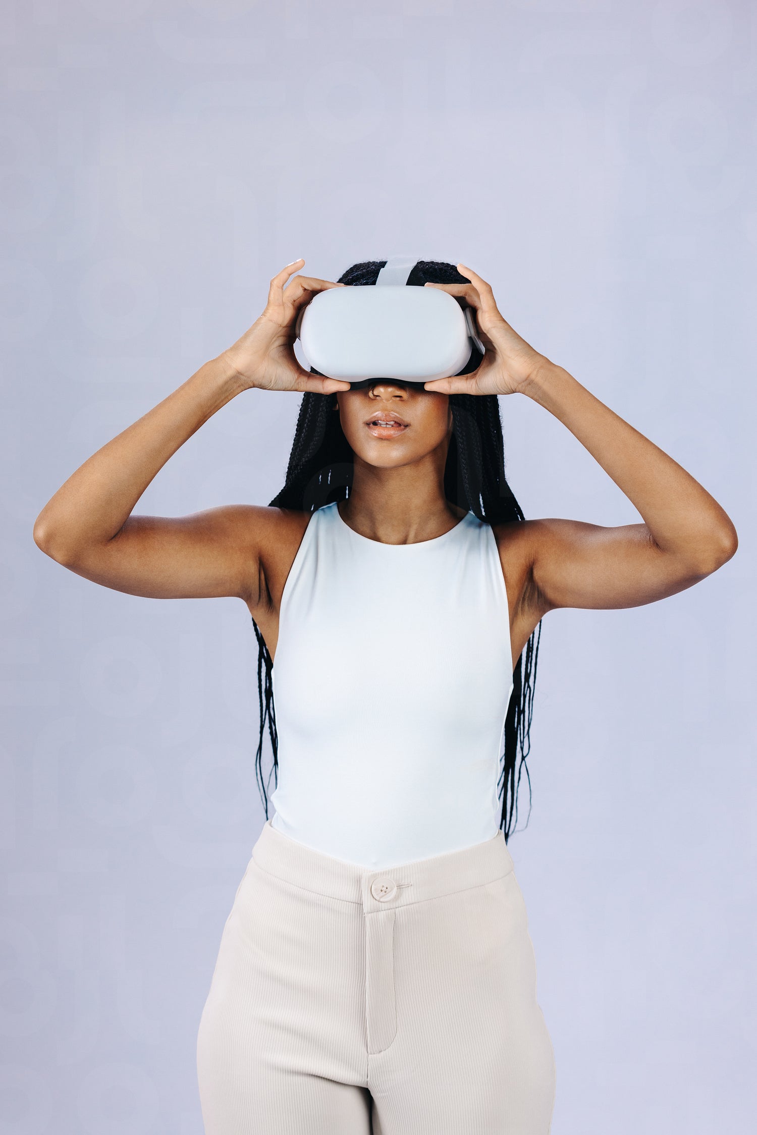 Young woman getting into the metaverse world using a vr headset. Woman looking through virtual reality goggles while standing against a studio background. Young woman exploring modern 3D technology.