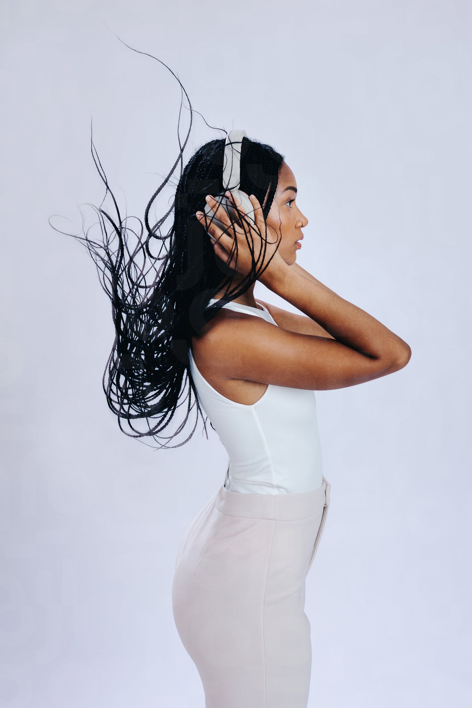 Young woman with black braids listening to music on wireless headphones. Fashionable young woman enjoying her favourite playlist while standing against a studio background.