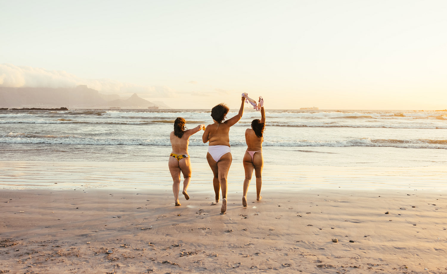 Women enjoying summer in their natural bodies. Rearview of three topless young women running towards the sea water while wearing bikini bottoms. Carefree female friends having fun during vacation.