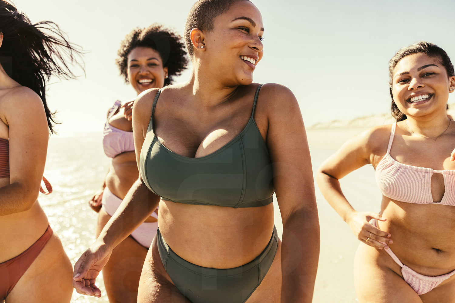 Women running in bikinis at the beach. Group of carefree young women smiling cheerfully while running in the sun. Happy female friends having fun and enjoying their summer vacation.