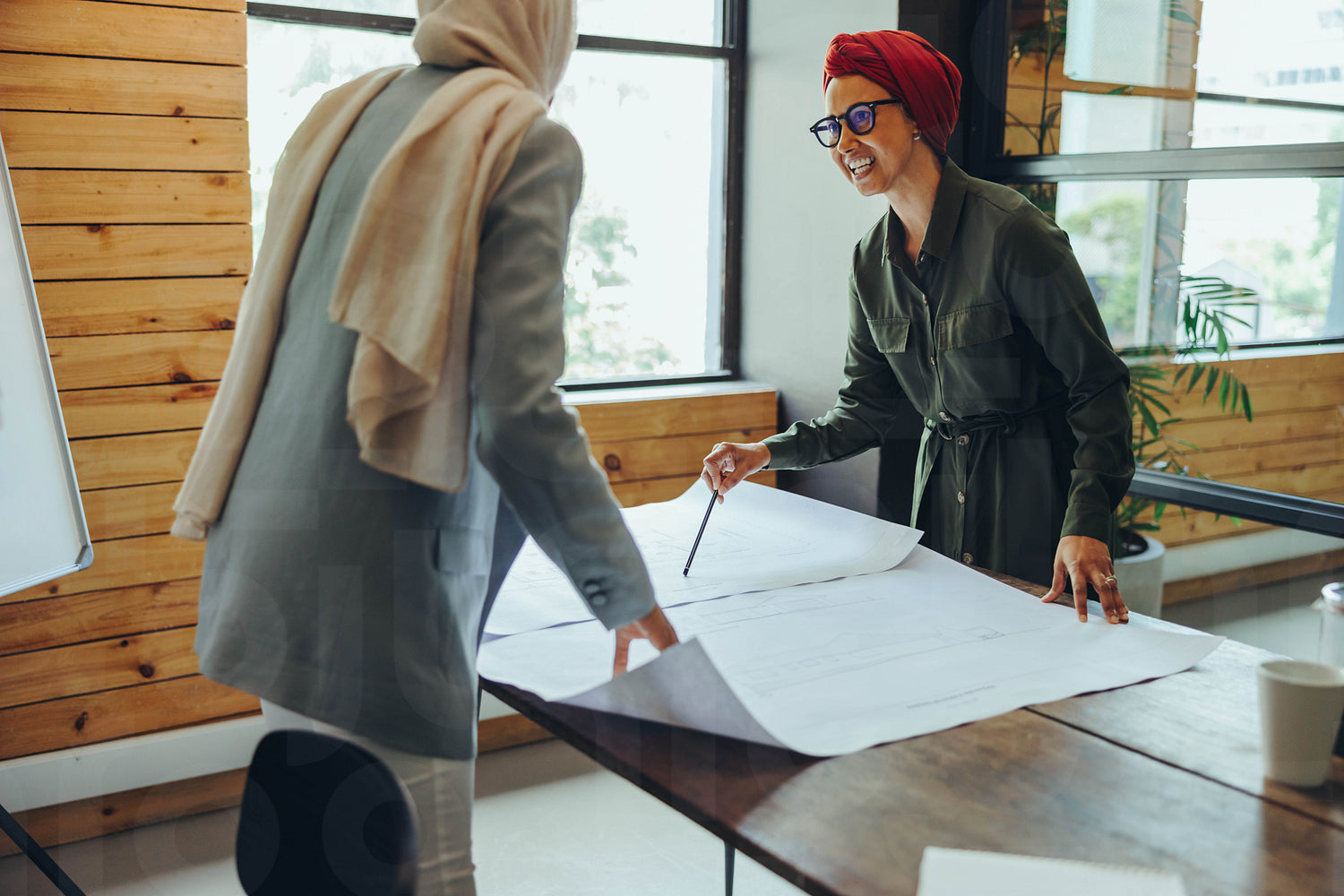 Two Muslim designers having a discussion while working with blueprint drawings. Creative businesswomen planning an innovative project. Female architects wearing headscarfs in an inclusive workplace.