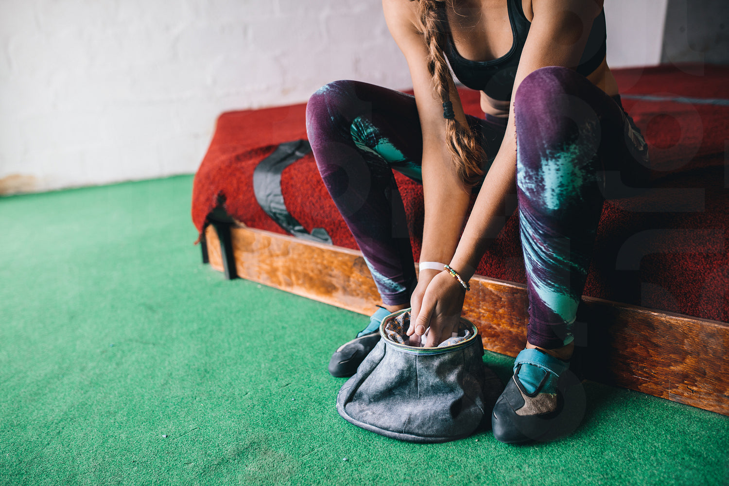 Cropped shot of woman at a wall climbing gym applying magnesium chalk powder on hands from a bag.