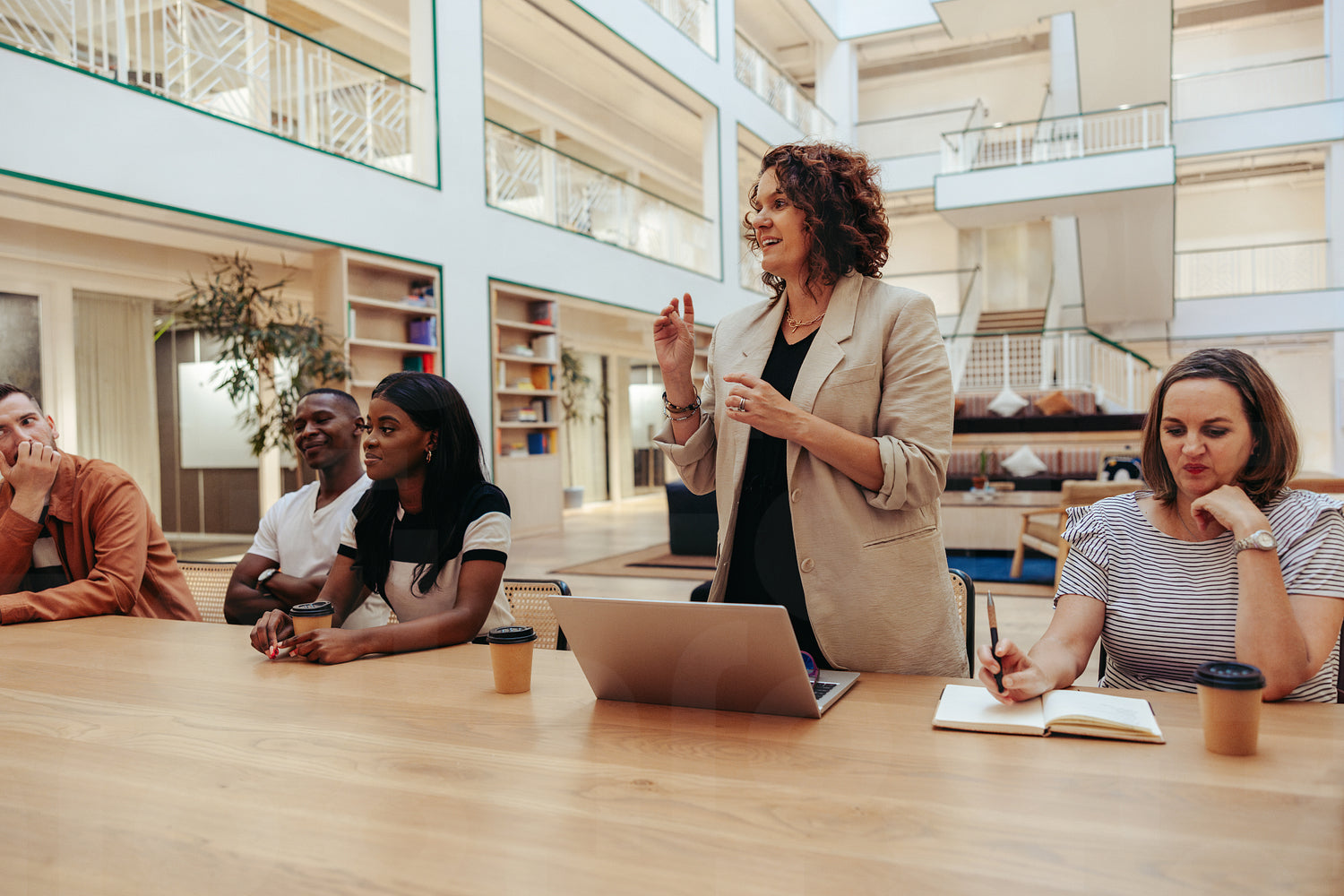 A diverse group of advertising professionals participates in a business meeting at an agency. A caucasian woman leads the discussion, creating an engaging and dynamic work environment.