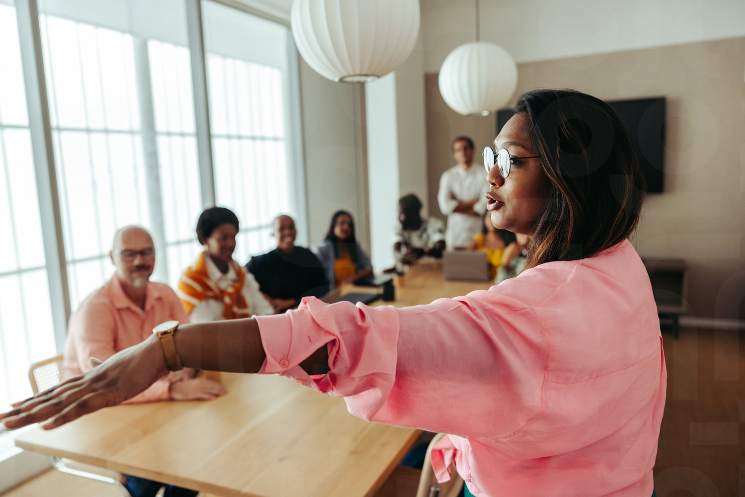 Confident Indian businesswoman leading a diverse meeting with engaged team members