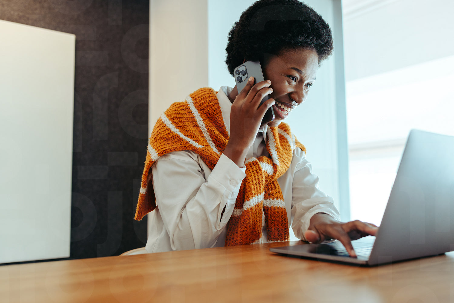 A smiling businesswoman converses on the phone while engaging with her laptop. She exudes a professional and positive demeanor, highlighting the modern work environment and technological connectivity.