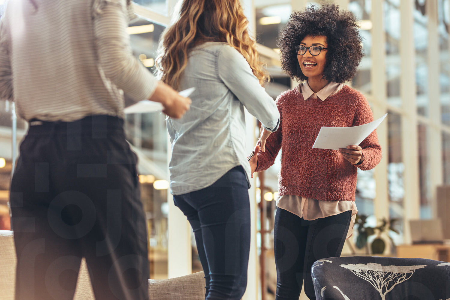 Woman entrepreneur holding official papers greeting a business client at work place. Businesswoman shaking hands with a woman standing in office.