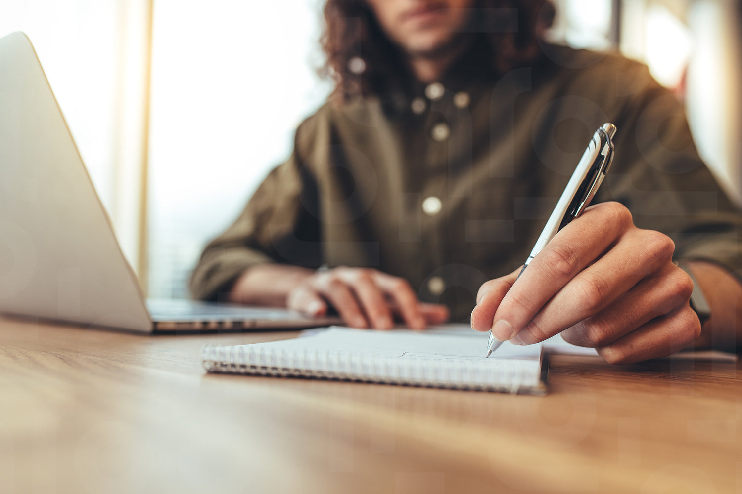 Businessman writing in notepad with a laptop on the desk. Close up of hand of businessman holding pen and making notes.
