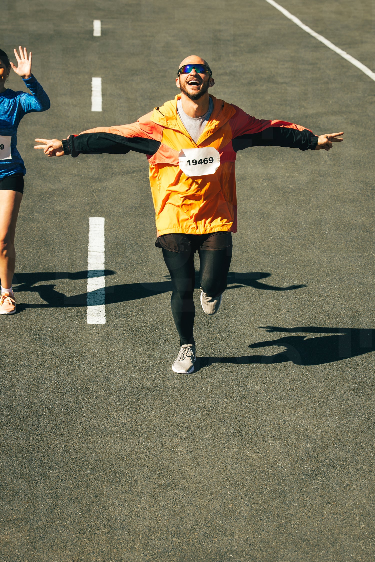 A male runner in an athletic outfit and sunglasses celebrates at the finish line of a race. His arms are outstretched with a joyful expression, embodying determination and achievement.
