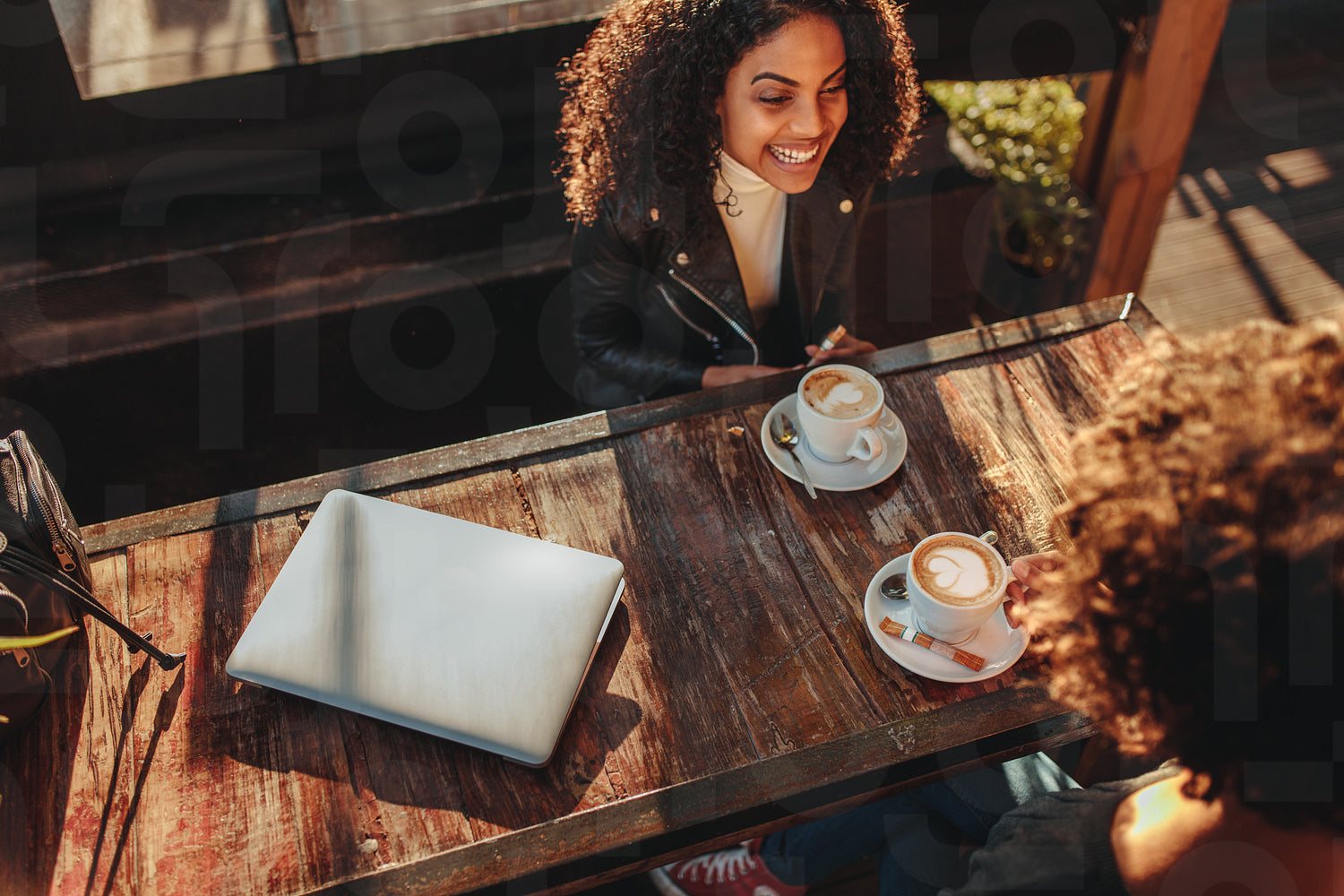 Friends meeting at a coffee shop. Two women sitting across a table with coffee cups and a laptop.