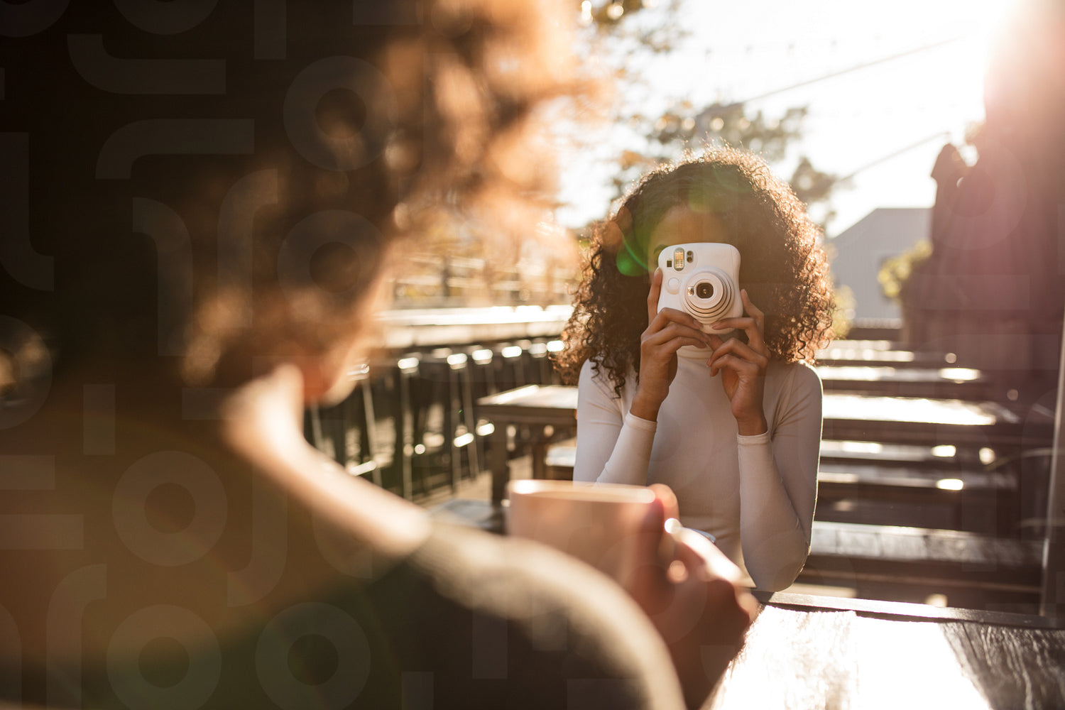 Woman taking photo of her friend using an instant digital camera. Woman holding a coffee cup being photographed by her friend outdoors.
