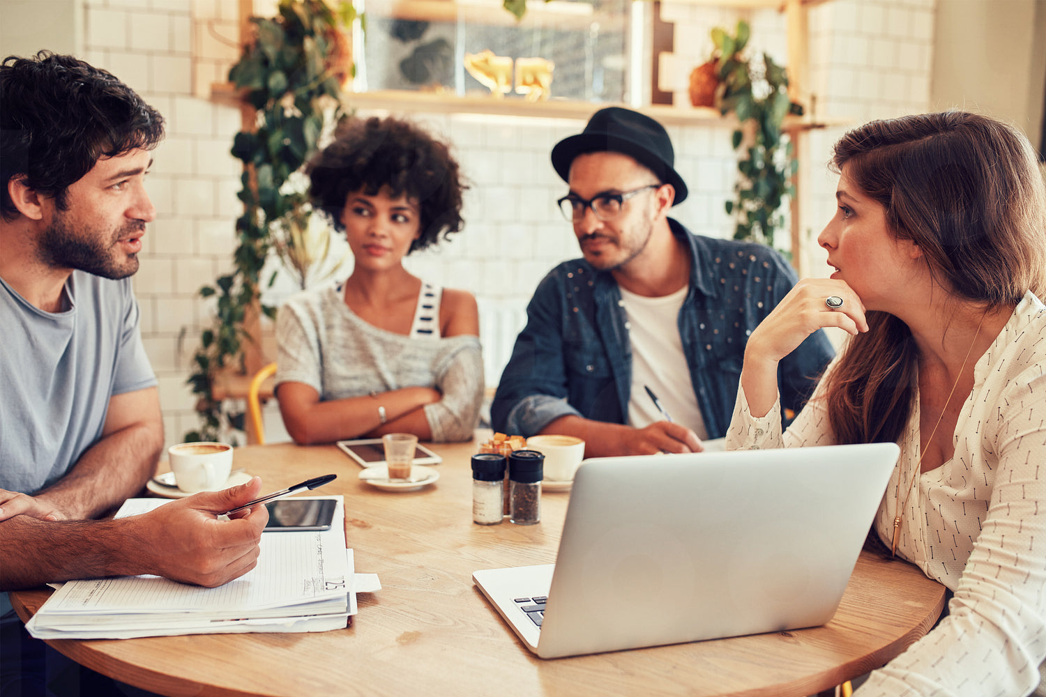 Portrait of young people sitting around in cafe with a laptop. Creative team meeting in a coffee shop for discussing new business projects.