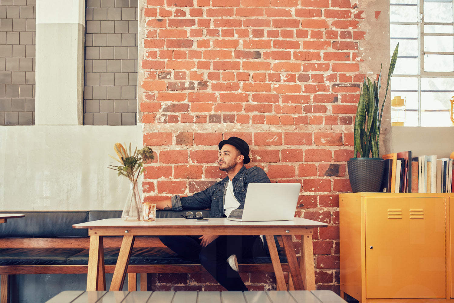 Portrait of young man sitting alone at a cafe with laptop on table. Caucasian man waiting for someone at coffee shop.