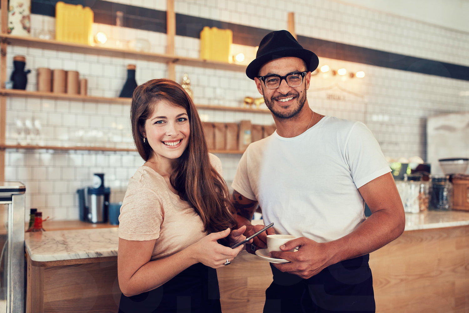 Portrait of happy young couple at cafe with a cup of coffee and digital tablet. Caucasian couple standing together a cafe counter and looking at camera and smiling.