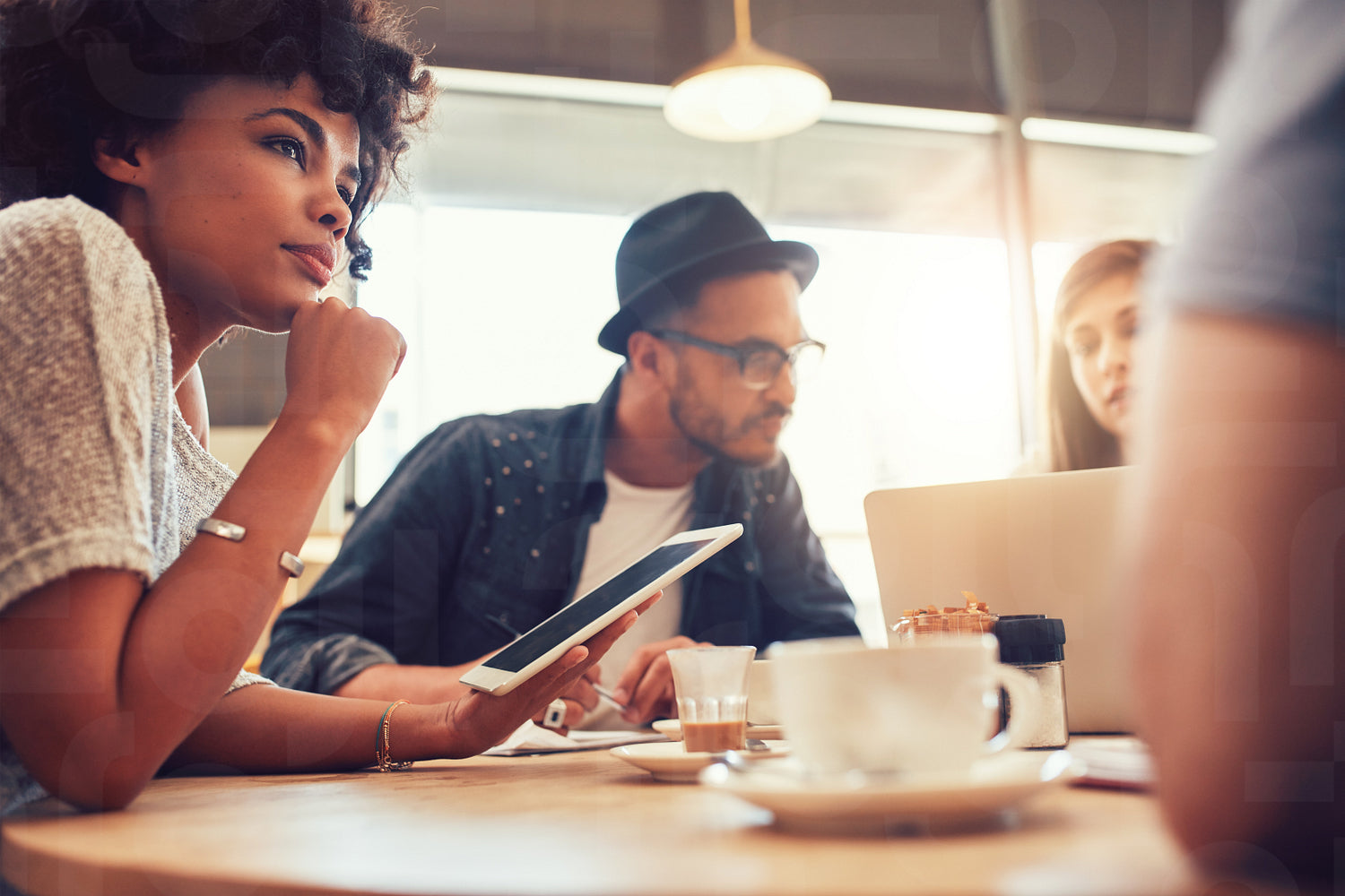 Close up portrait of african woman with digital tablet and people in background at a cafe table. Young friends sitting at a coffee shop with laptop and digital tablet.