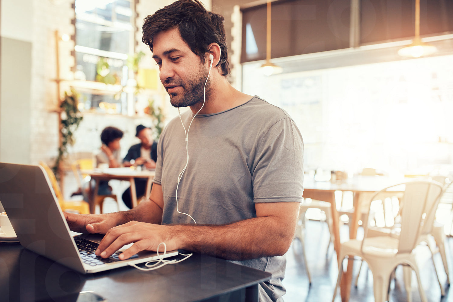 Portrait of handsome young man with earphones working on laptop while sitting at a coffee shop. Young guy at a cafe surfing internet on laptop.