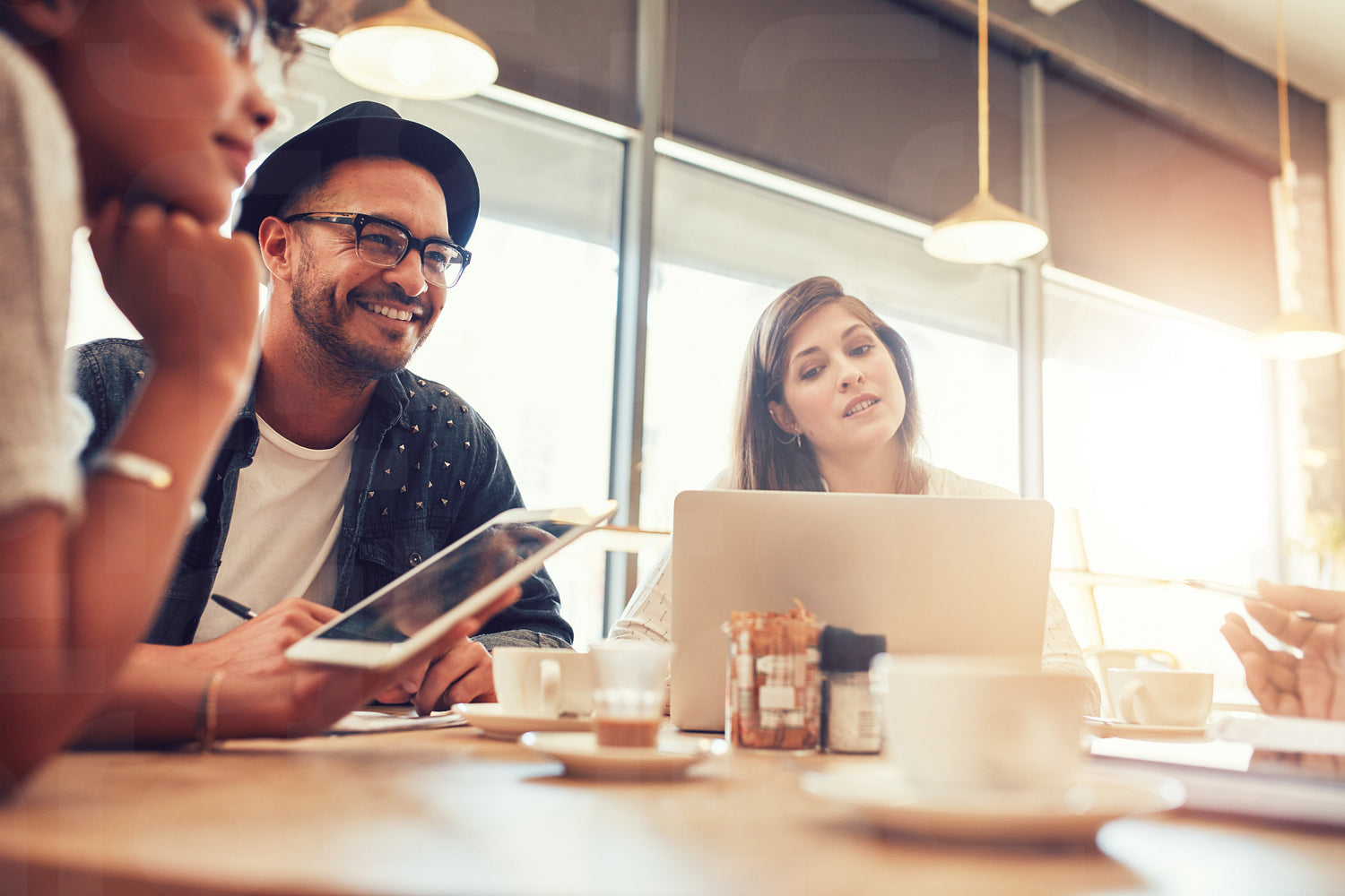 Portrait of happy young man sitting and talking with friends at a cafe. Young people at a coffee shop with digital tablet and laptop.