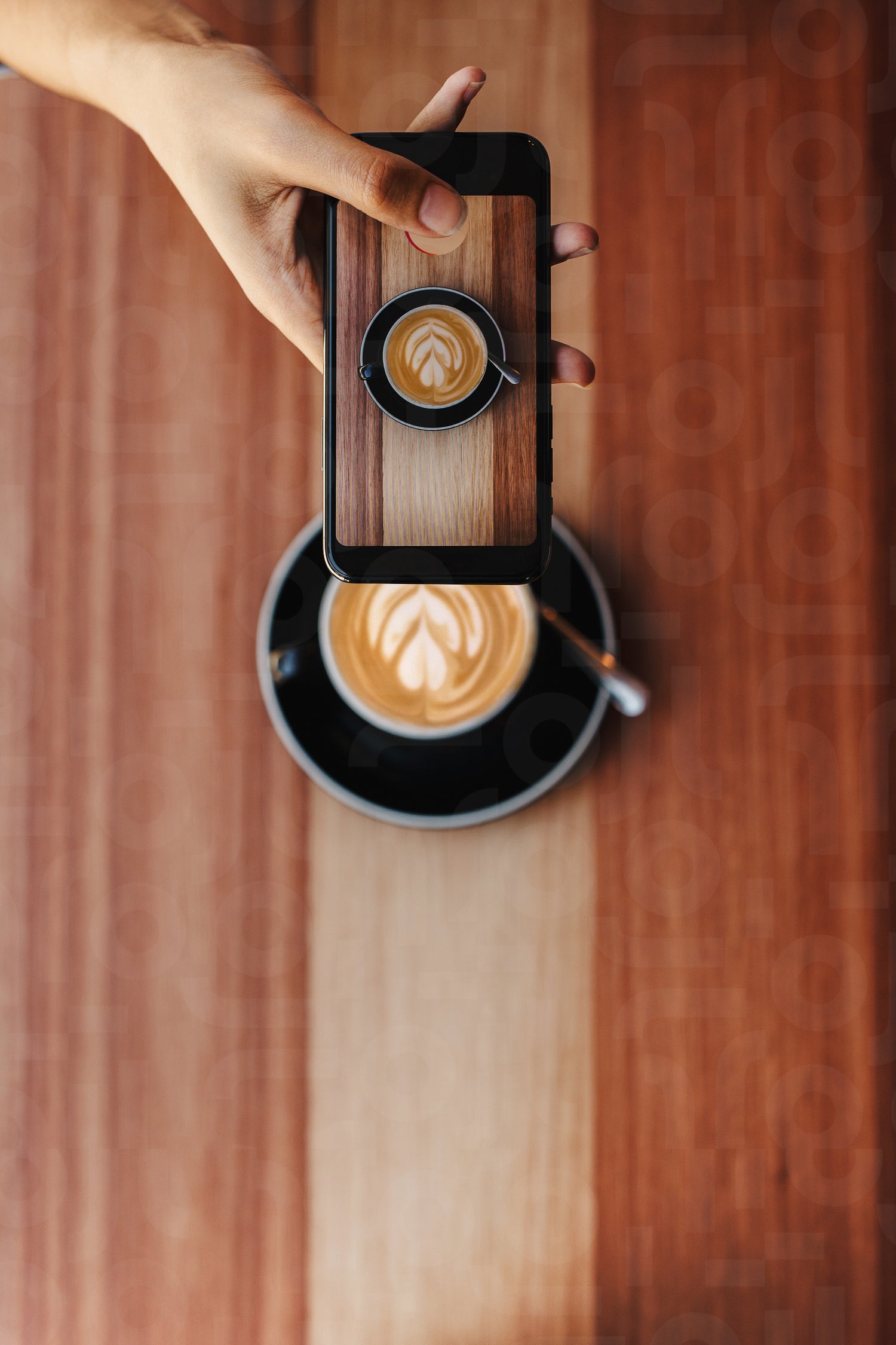 Close up of a female hand holding cell phone to take photo of hot cup of coffee. Woman sharing the picture of her coffee on social media.