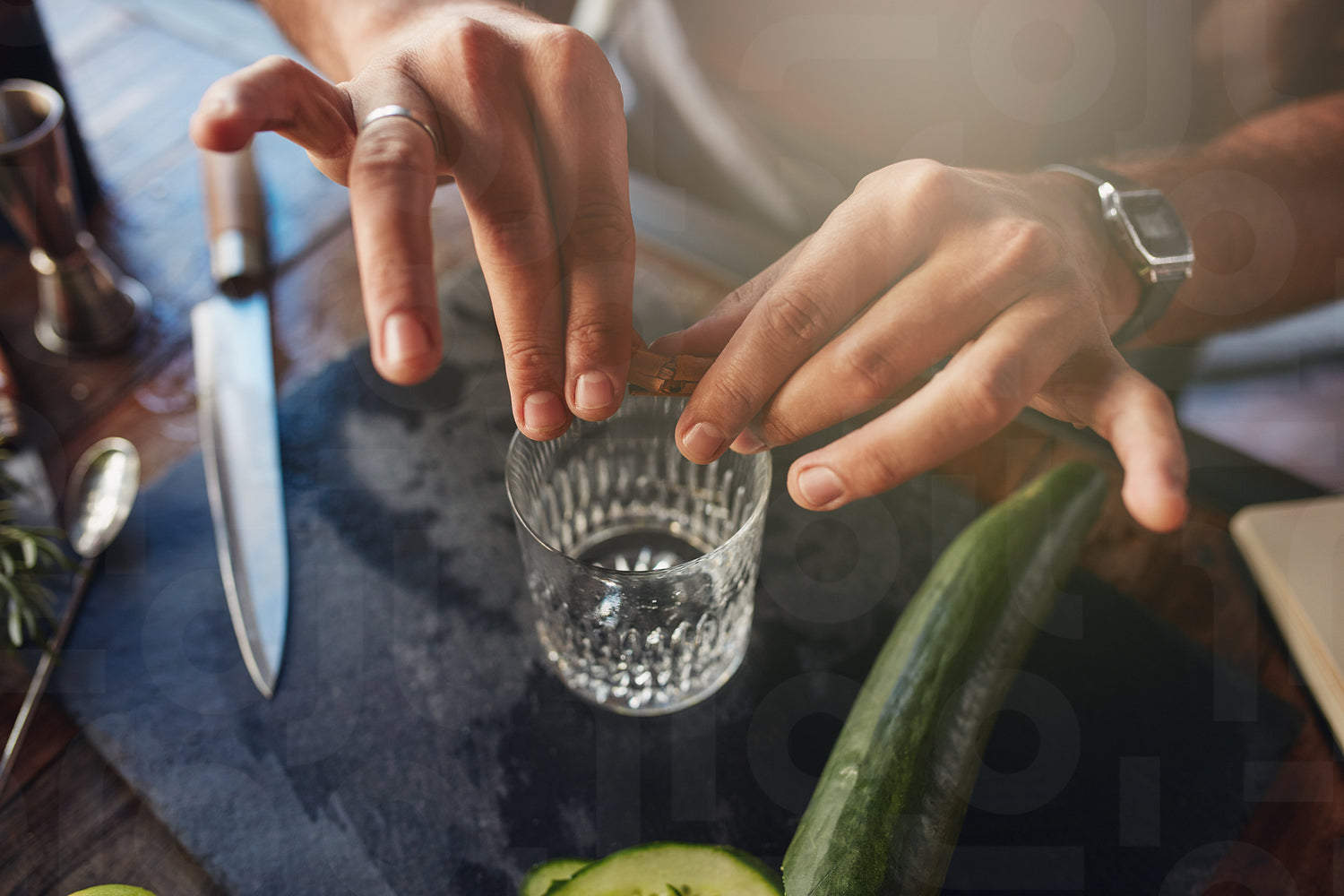 Top view of bartender hands preparing cocktail. Experimenting with new recipe to make a cocktail drink.