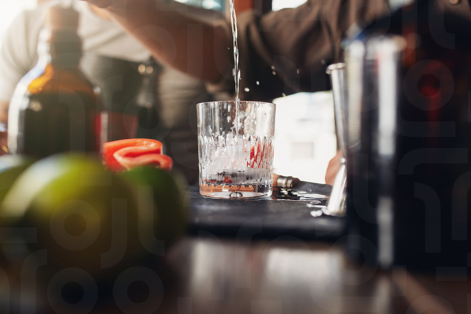Closeup shot of bartender pouring drink into a glass on counter. Barman preparing cocktail.
