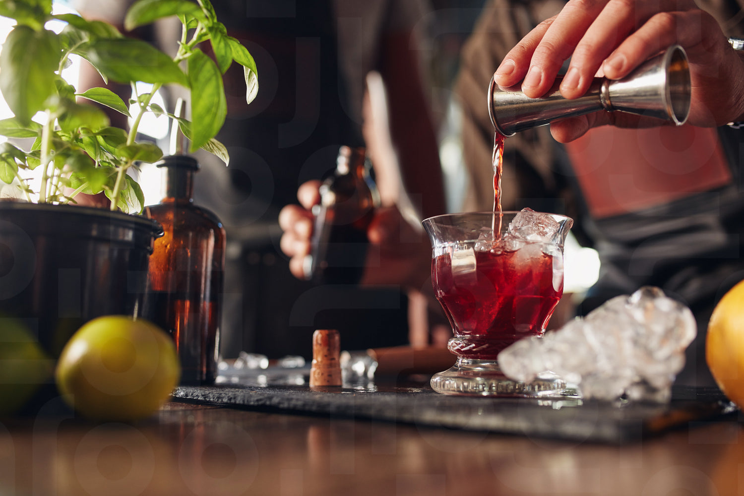 Close up shot of barman hand pouring drink from measuring cup into a cocktail glass filled with ice cubes. Male bartender preparing fresh cocktail.