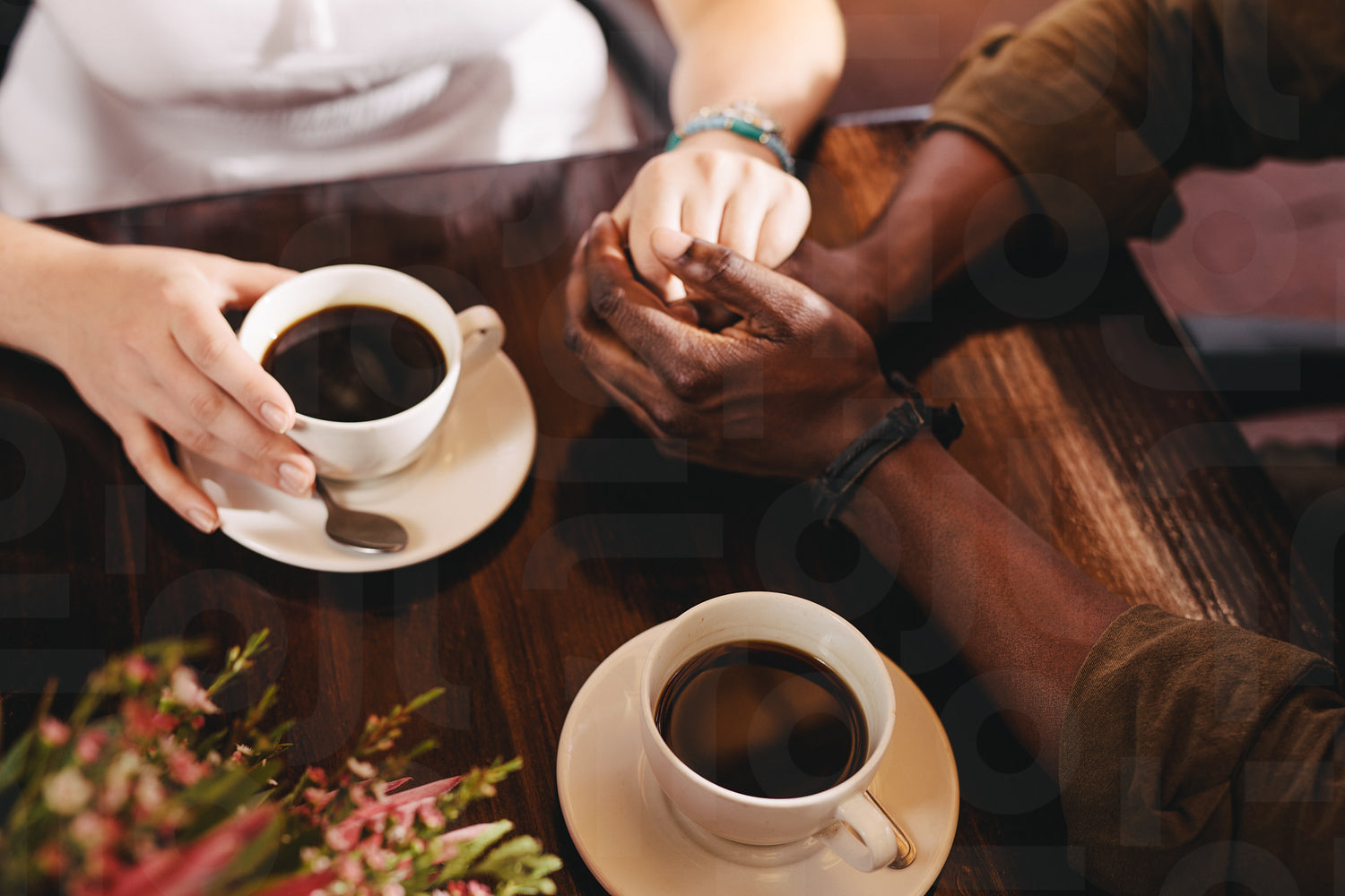 Couple on a date sitting at a coffee shop table. Close up of man holding hand of a woman on a table with cups of coffee by the side.