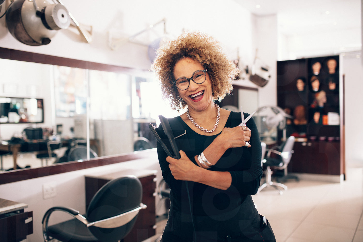 Smiling female hairdresser holding a hair straightener and scissors. Well equipped beauty salon with professional hairdresser.