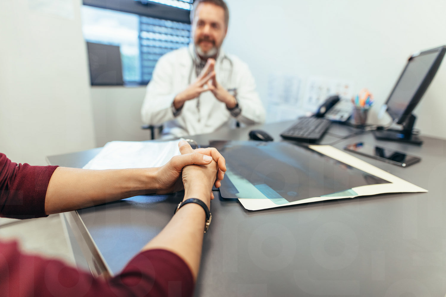 Female sitting at table in clinic with doctor in background. Focus on woman patient hands visiting doctor. Woman meeting with medical doctor to seek advice.