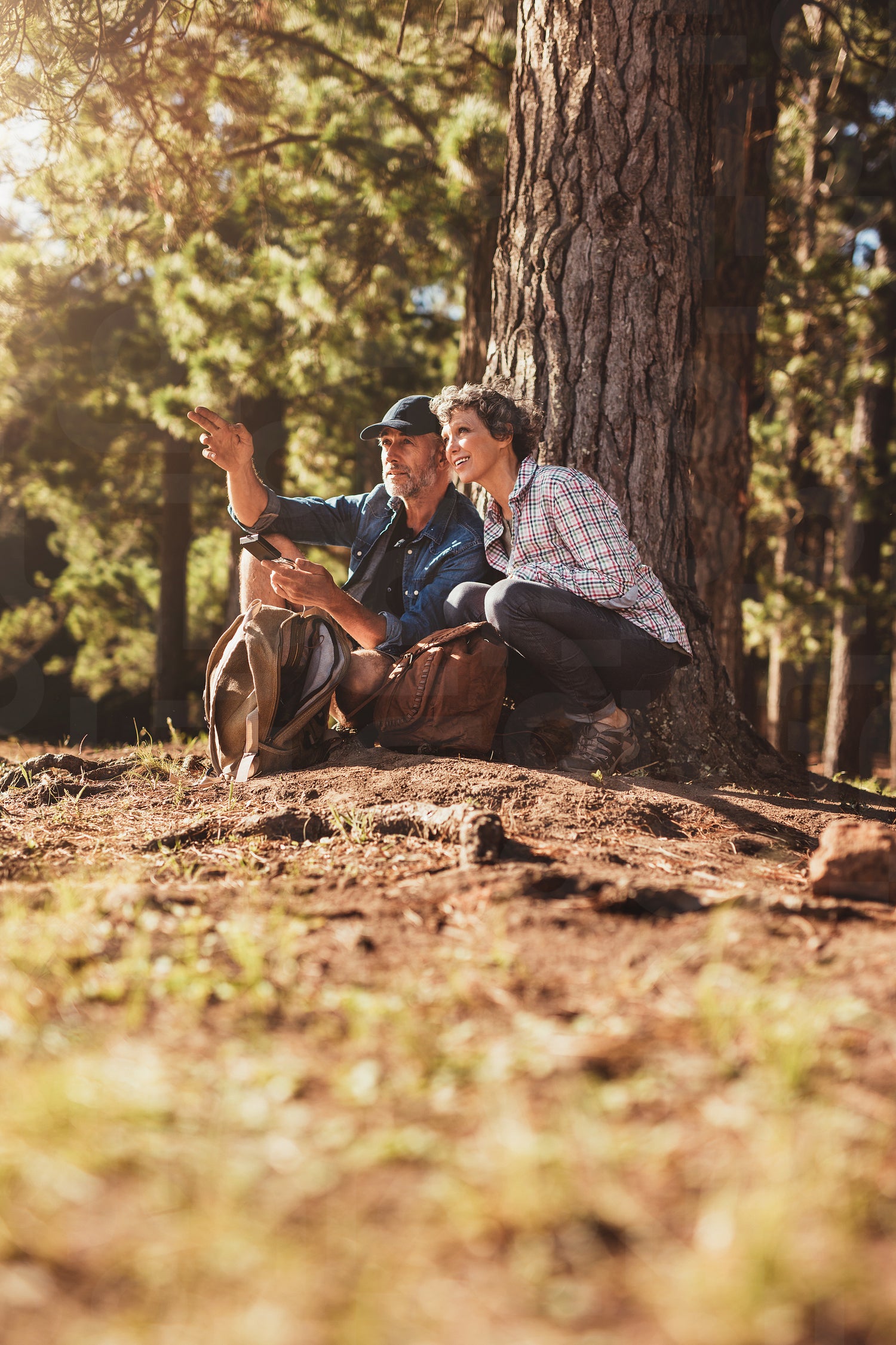 Senior couple hiking in nature with man holding a compass and showing the direction to woman. Couple during hike using a compass in the countryside