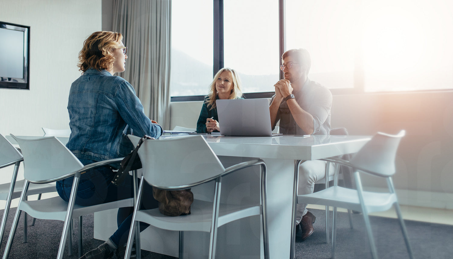 Woman sitting in a conference room for a job interview situation. Authentic image in modern office space.