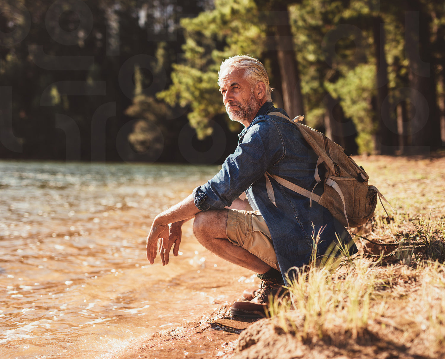 Portrait of a mature man sitting next to a lake admiring the view. Male hiker relaxing by a lake and looking away at a view.