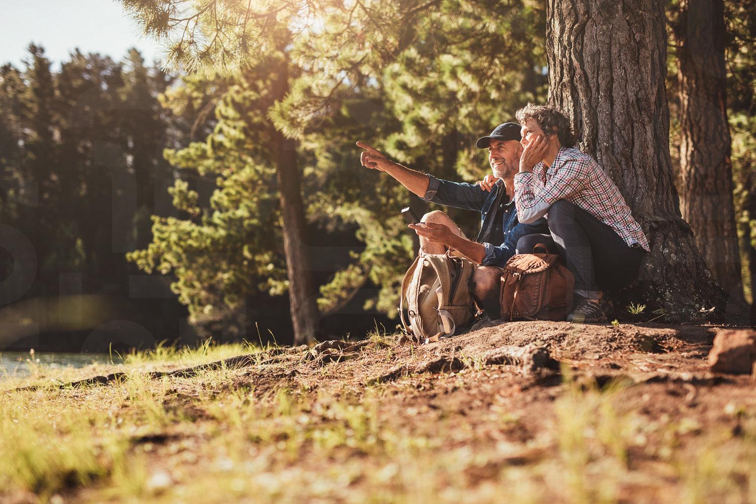 Outdoor shot of senior couple with navigational instruments looking for way in countryside. Mature sitting near a lake during a hike using compass for directions.