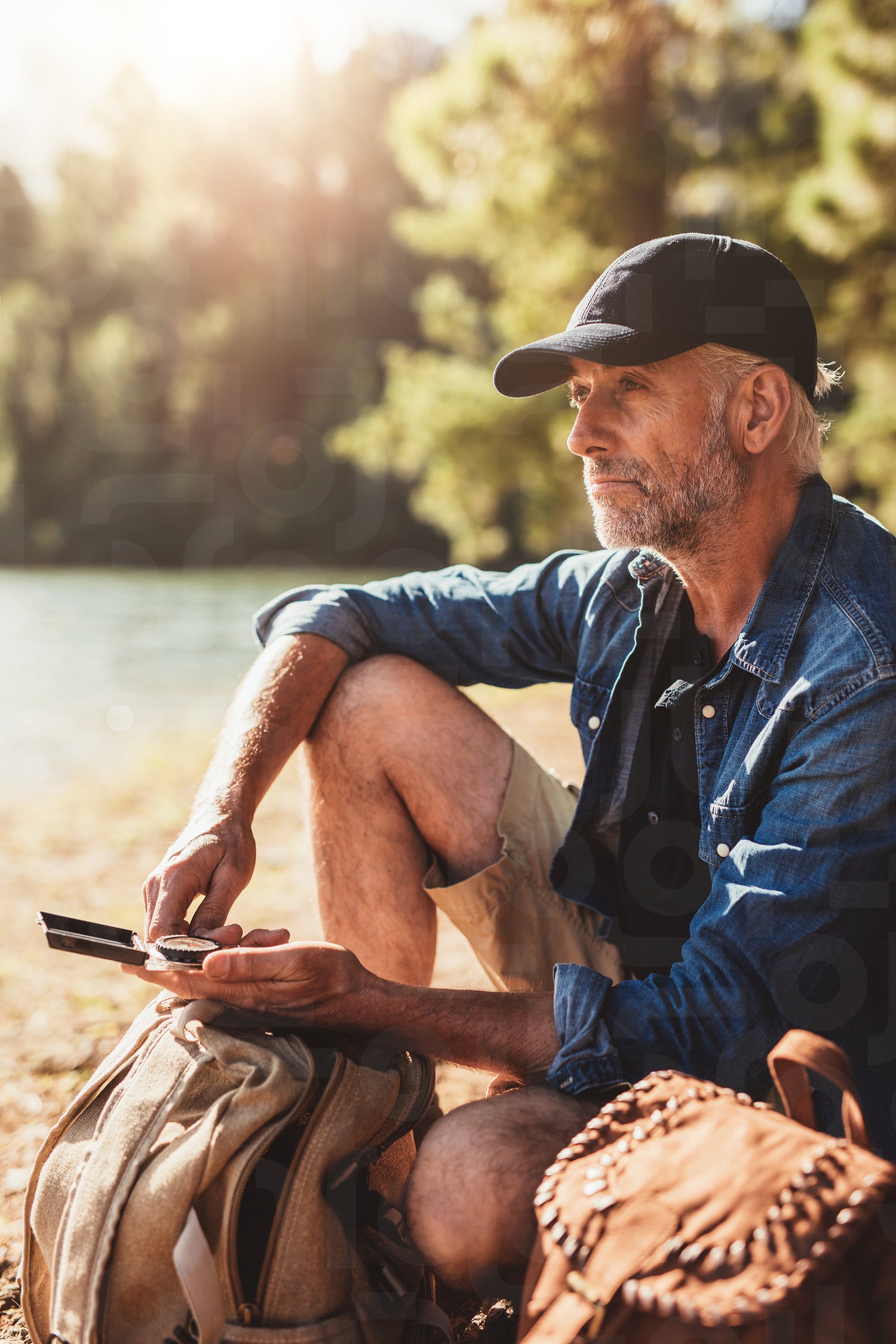 Portrait of mature man with a compass sitting with backpack looking away at a view. Senior hiker sitting by a lake on summer day.