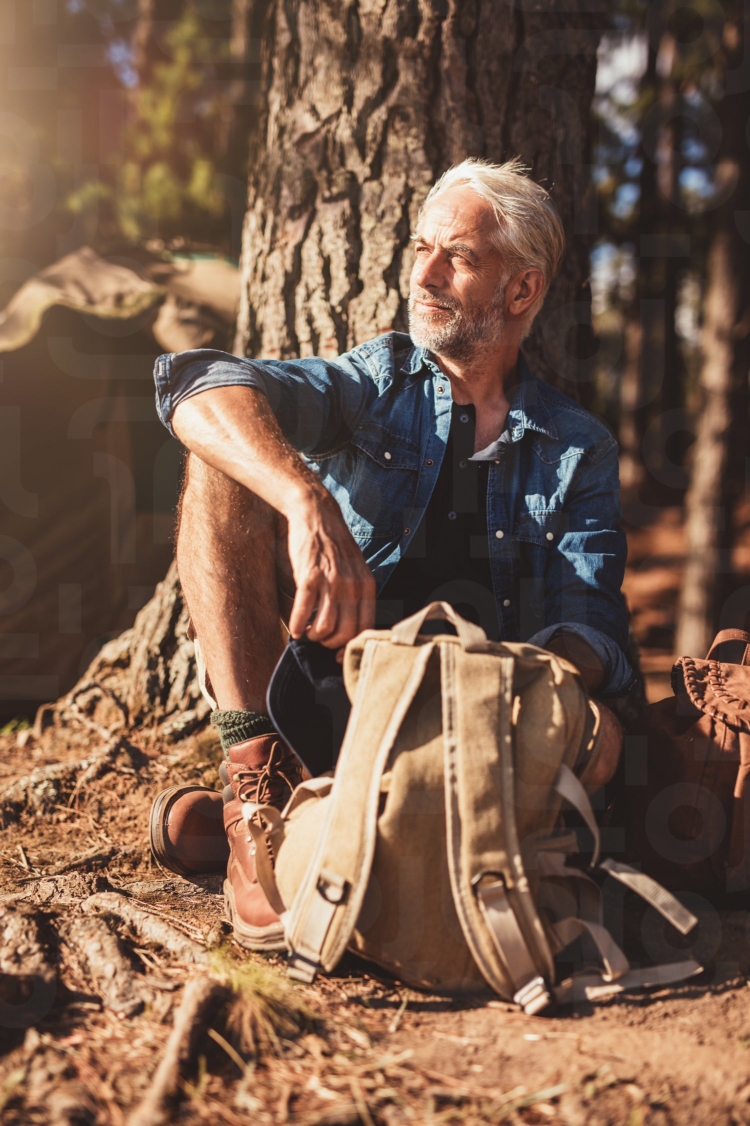 Portrait of senior man looking away while sitting by a tree. Senior man with a backpack outdoors on a summer day.