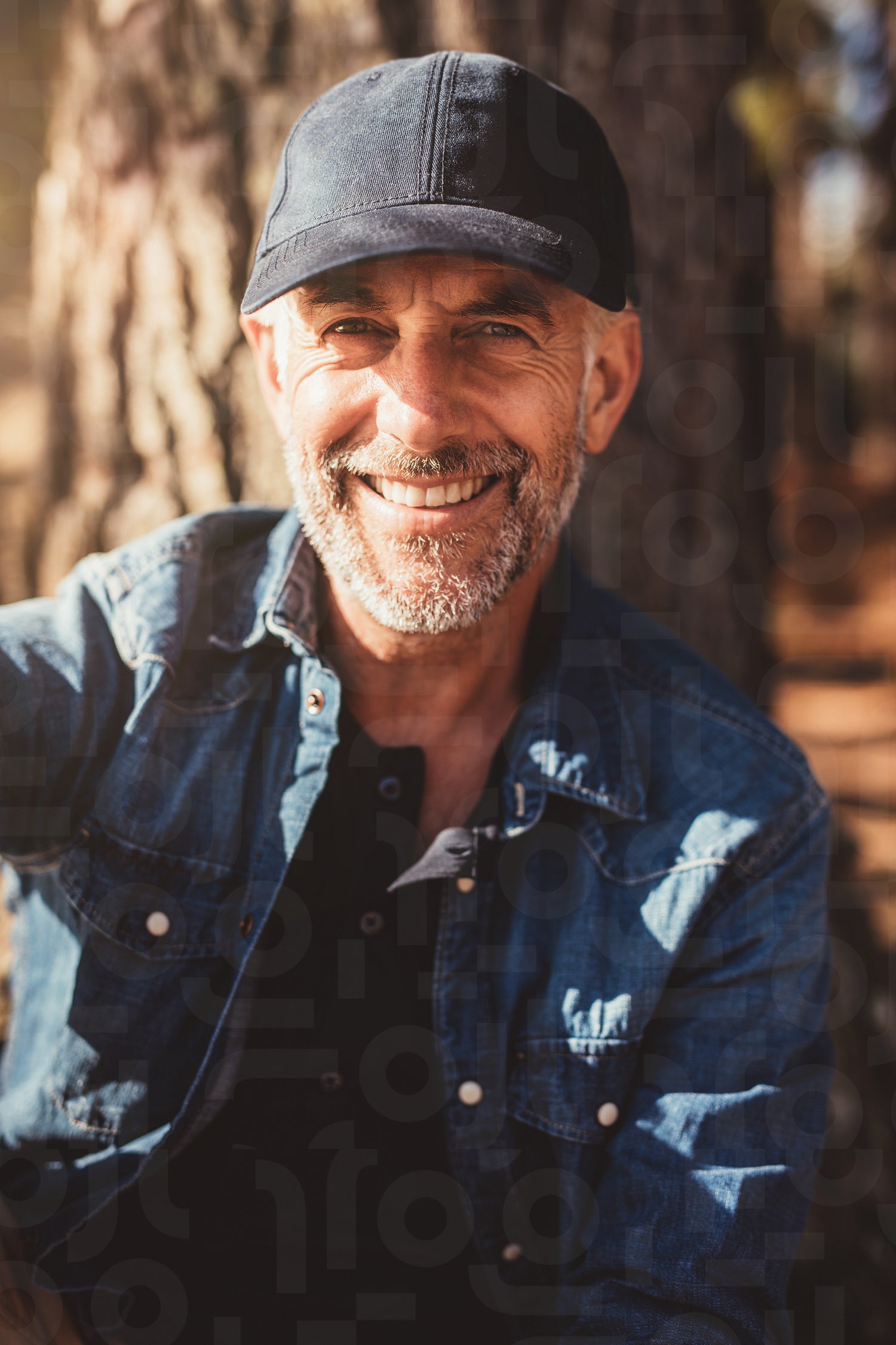 Close up portrait of happy mature man wearing cap looking at camera and smiling. Senior man sitting by a tree on summer day.