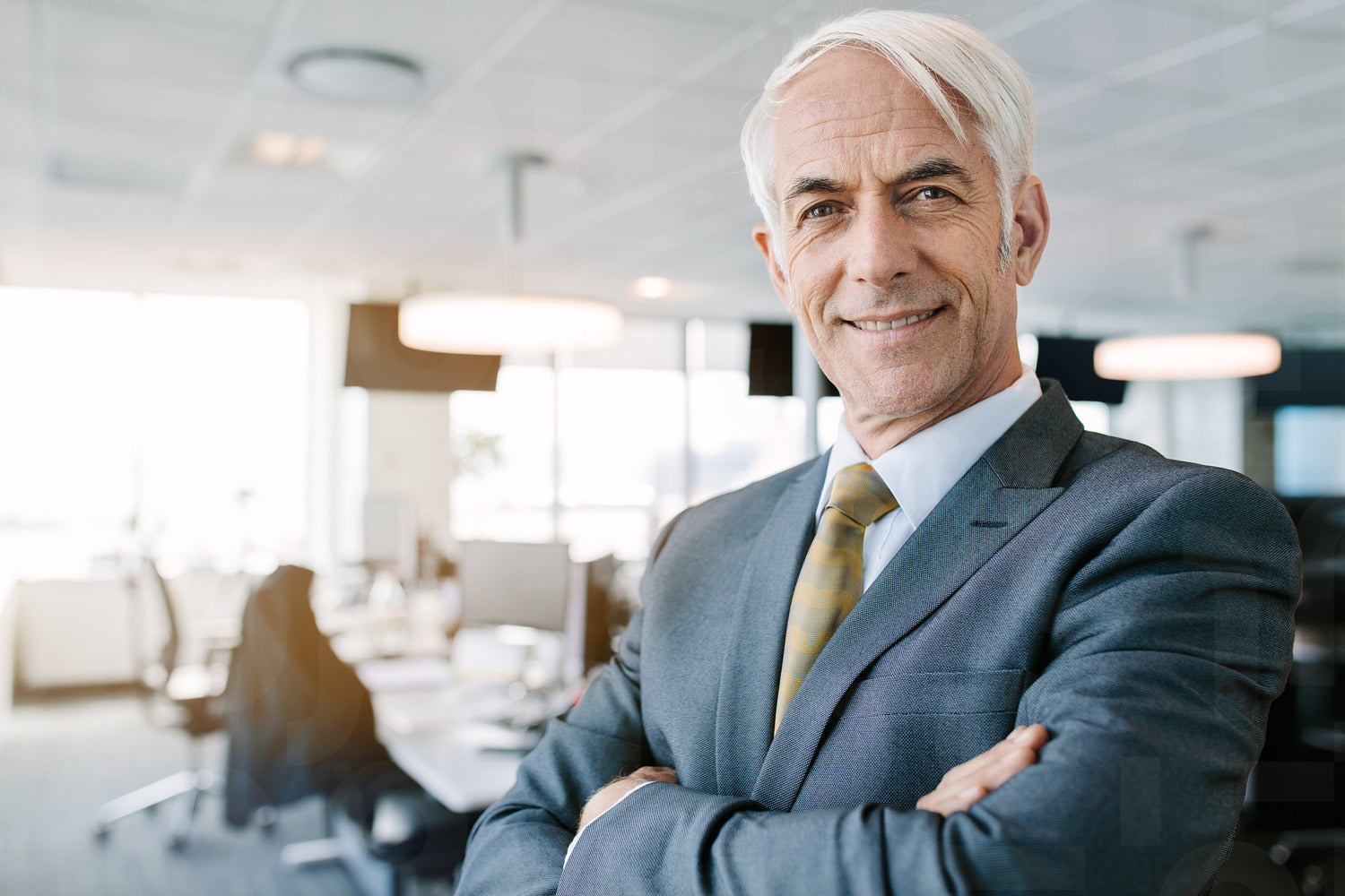 Portrait of successful senior businessman standing in office with his arms crossed. Caucasian male entrepreneur in suit looking at camera with a smile.