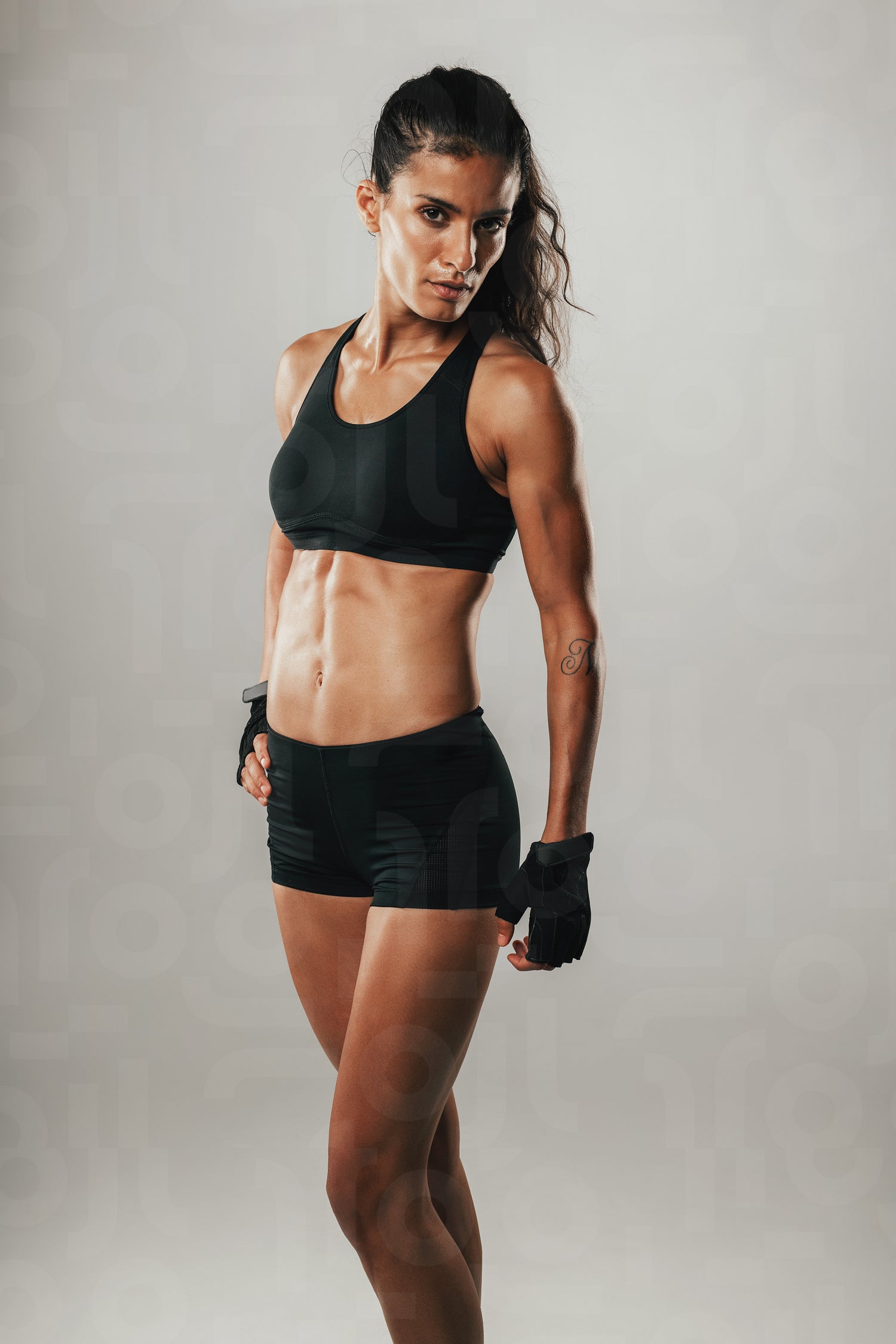 Pretty woman in athletic shorts stares at camera while posing against a grey background
