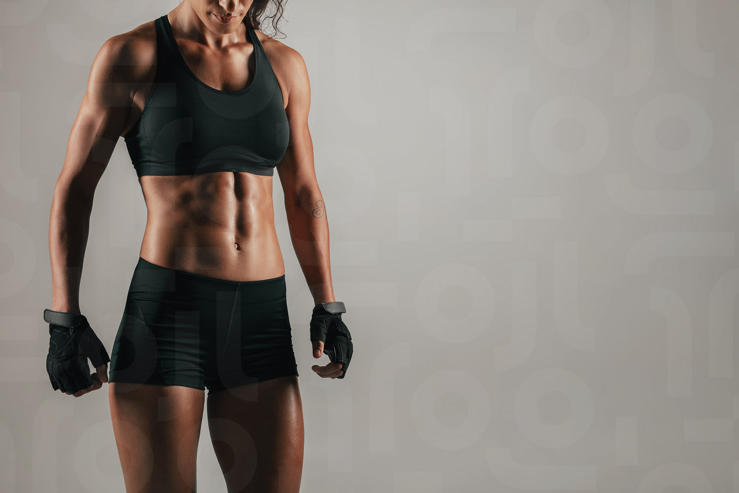 Tight view of woman in black weight lifting gloves with strong abdominal muscles over gray background with copy space