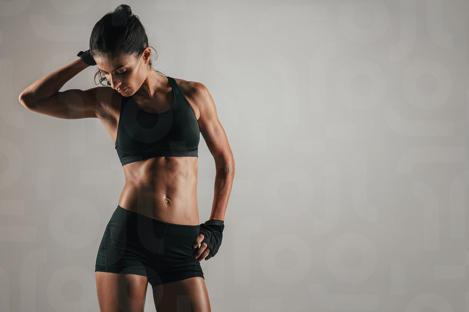 Beautiful muscular female athlete flexing bicep while holding hair over gray background with copy space