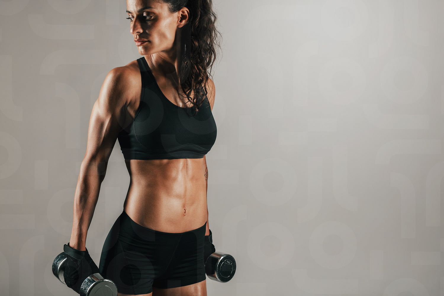 Three quarter view on gorgeous single athletic woman resting with chrome finished dumbbell weights at her sides while looking over